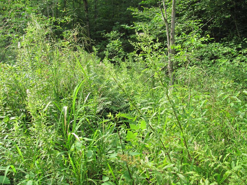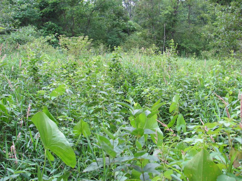 This type is distinguished from the various graminoid-dominated marsh types by its broad-leaf dominants. The Herbaceous Vernal Pond type is related to this, but occurs exclusively in upland depressions that dry out substantially to completely in the dry season. This type is distinguished from the various forb and graminoid-dominated marsh types by species composition and landscape position. It is distinguished from the graminoid-dominated marsh types by the dominance of broad-leaved species. Although reed canary-grass (Phalaris arundinacea) and bluejoint (Calamagrostis canadensis var. canadensis) may occur in this community type, they are not dominant. If one of these species or a combination of the two dominates the community, the community may be better represented by Bluejoint – Reed Canary-grass Marsh. If tussock sedge (Carex stricta) strongly dominates the community, then the community would better be represented by Tussock Sedge Marsh. The Rice Cutgrass – Bulrush Vernal Pool or Wool-grass – Mannagrass – Mixed Shrub Vernal Pool types may resemble the Mixed Forb Marsh type but these two occurs exclusively in upland depressions that dry out substantially to completely in the dry season. The Mixed Forb Marsh community may also resemble the Freshwater Tidal Mixed High Marsh and Riverbank Freshwater Tidal Marsh communities. However, the presence of tidal marsh species such as wild-rice (Zizania aquatica), salt-marsh water-hemp (Amaranthus cannabinus), and swamp beggar’s-ticks (Bidens bidentoides) in these types differentiates from the more Mixed Forb Marsh.