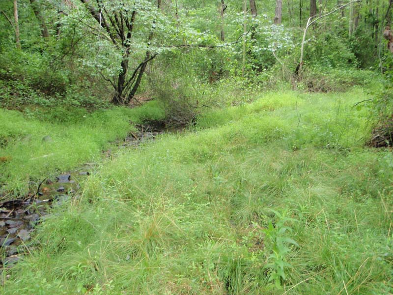This community type is restricted to areas underlain by serpentinite bedrock. Seeps occur on gentle slopes at the base of low hills and are adjacent to streams or may be stream headwater areas. Groundwater enriched with magnesium and various heavy metals (i.e., chromium and nickel) saturates the surface for a substantial portion of the growing season. Graminoids dominate; tufted hairgrass (Deschampsia cespitosa), rice cutgrass (Leersia oryzoides), spike-rush (Eleocharis tenuis var. pseudoptera), and deer-tongue grass (Dichanthelium clandestinum) are common. Other species that are characteristic of these seeps include straw-colored nutsedge (Cyperus strigosus), muhly (Muhlenbergia mexicana), swamp thistle (Cirsium muticum), smartweeds (Polygonum spp.), bugleweed (Lycopus uniflorus), a moss (Philonotis capillaris), Indian-grass (Sorghastrum nutans), whip-grass (Scleria triglomerata), purple gerardia (Agalinis purpurea), American burnet (Sanguisorba canadensis), and boneset (Eupatorium perfoliatum). This community type is part of the serpentine barrens complex.
