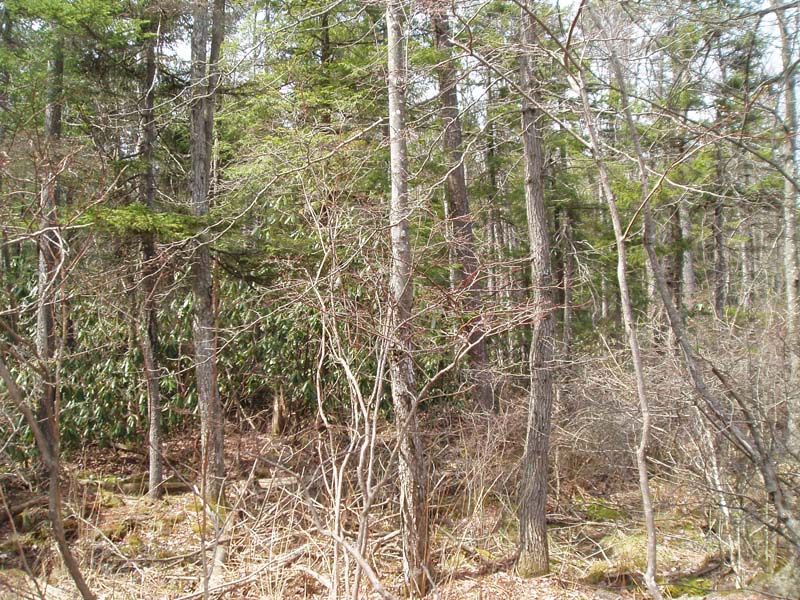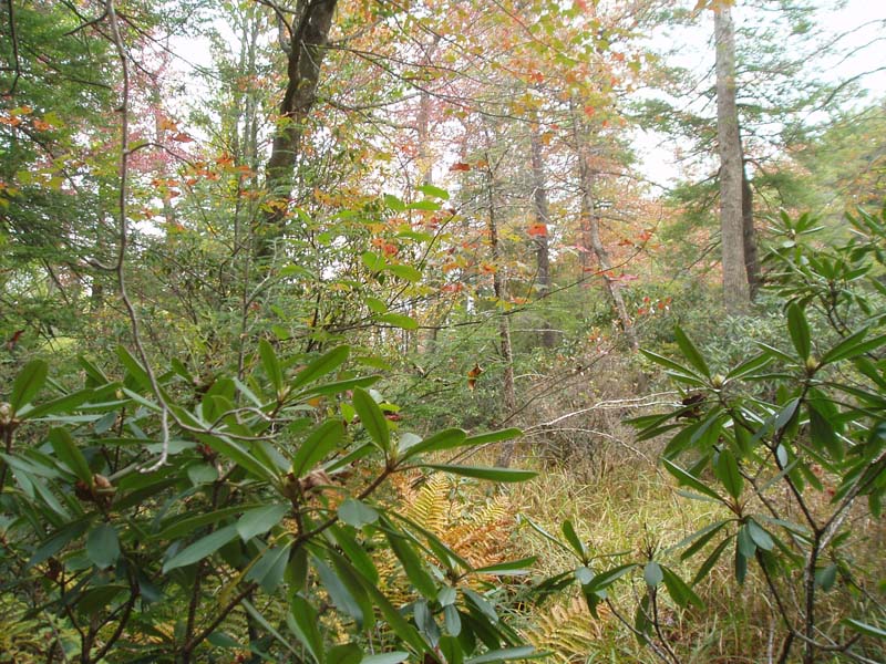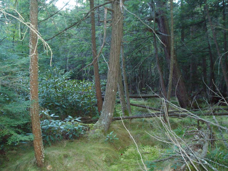 This describes a group of wetland forests that are dominated by a mixture of conifers and hardwood species. The substrate is usually mineral soil or muck over mineral soil. There is generally some groundwater enrichment in these systems. Eastern hemlock (Tsuga canadensis) contributes between 25% to 75% of the canopy. Other conifer species that may occur with hemlock include eastern white pine (Pinus strobus), red spruce (Picea rubens), and tamarack (Larix laricina). The most common hardwood species are yellow birch (Betula alleghaniensis), red maple (Acer rubrum), black ash (Fraxinus nigra), blackgum (Nyssa sylvatica), and gray birch (Betula populifolia). Rosebay (Rhododendron maximum) often forms a dense understory; other shrubs include highbush blueberry (Vaccinium corymbosum), winterberry (Ilex verticillata), swamp azalea (Rhododendron viscosum), and witherod (Viburnum cassinoides). Herbaceous species include cinnamon fern (Osmunda cinnamomea), sedges (e.g., Carex trisperma, Carex prasina, Carex leptalea), violets (Viola spp.), skunk-cabbage (Symplocarpus foetidus), false hellebore (Veratrum viride), sensitive fern (Onoclea sensibilis), partridge-berry (Mitchella repens), gold-thread (Coptis trifolia), Canada mayflower (Maianthemum canadense), crested wood fern (Dryopteris cristata), and purple-stemmed aster (Symphyotrichum puniceum). The bryophyte layer is usually well developed and may be dominated by sphagnum.
