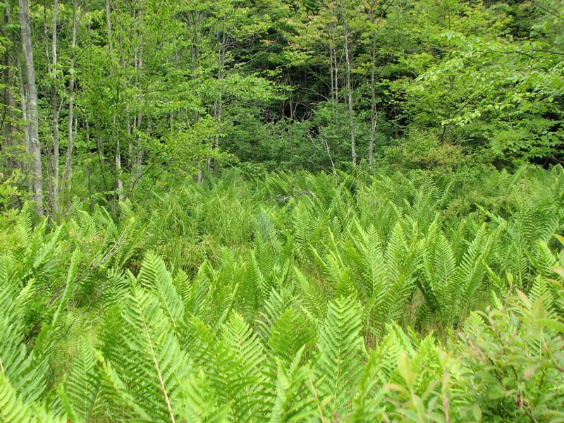 Highbush blueberry (Vaccinium corymbosum) and meadow-sweet (either Spiraea latifolia or Spiraea alba) are usually both present. Additional woody species include shadbush (Amelanchier spp.), speckled alder (Alnus incana ssp. rugosa), arrow-wood (Viburnum recognitum), steeplebush (Spiraea tomentosa), swamp dewberry (Rubus hispidus), winterberry (Ilex verticillata), elderberry (Sambucus canadensis), and seedling and sapling size red maple (Acer rubrum). The herbaceous layer is generally dominated by graminoids such as tussock sedge (Carex stricta), rushes (Juncus spp.), and spike-rushes (Eleocharis spp.), and by ferns, especially cinnamon fern (Osmunda cinnamomea), royal fern (O. regalis), sensitive fern (Onoclea sensibilis), and marsh fern (Thelypteris palustris). Forbs like marsh St. John's-wort (Triadenum virginicum), skunk-cabbage (Symplocarpus foetidus), and jewelweed (Impatiens spp.) may also occur. Sphagnum either forms a continuous layer or occurs on hummocks.