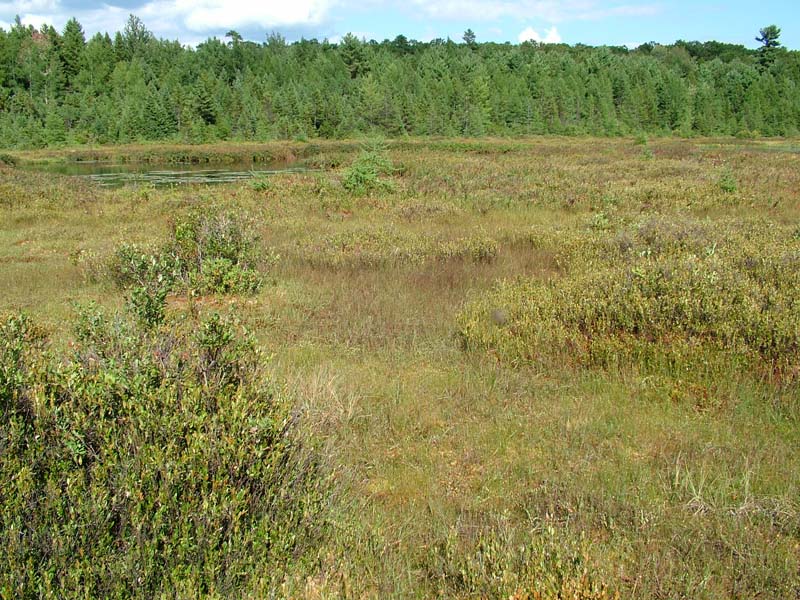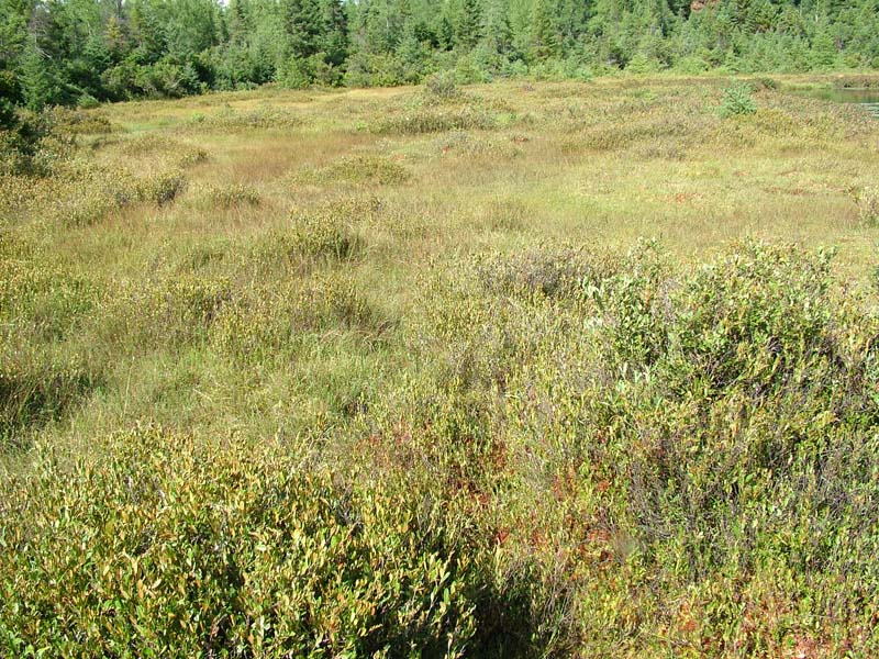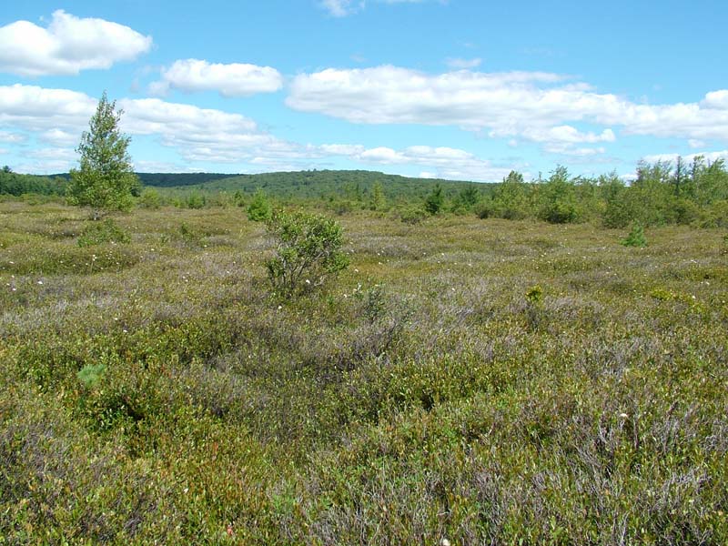 This dwarf shrub-dominated community (less than 0.5 m in height) is often part of the classic floating/quaking bog-mat community matrix found in glaciated areas of northern Pennsylvania. In glacial bogs, this community often occupies the central zone or one of the final zones of rooted vegetation surrounding an open water interior (also see water-willow (Decodon verticillatus) wetland type). This community type usually occurs in oligotrophic, peat-accumulating basins as part of the acidic glacial peatland complex. Substrate is organic and may be flooded at times but remains saturated throughout the growing season. The peatland where this community usually occurs may be oligotrophic or influenced by groundwater.
