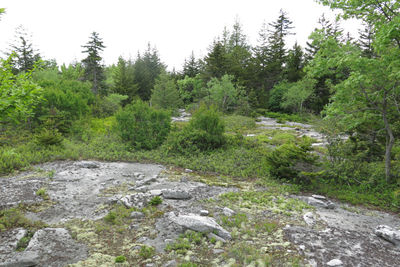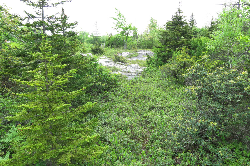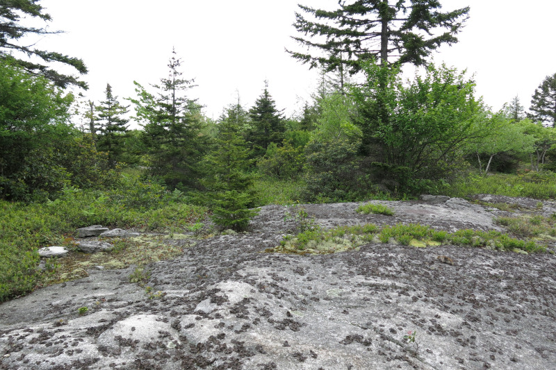 This type is similar to spruce-fir balds found to the north and south (at high elevations) of Pennsylvania but lacks the fir component (balsam fir to the north, Fraser fir to the south) found in those communities. It is known in this state from only one example, Bartlett Mountain in Wyoming County, Northeastern Pennsylvania. The site is north-facing on fractured bedrock at an elevation of about 2200’. Woody species occur in pockets of soil that have accumulated in cracks in the bedrock. There are extensive areas of bare or lichen-encrusted rock. Aside from red spruce (Picea rubens), tree species include gray birch (Betula populifolia), pitch pine (Pinus rigida), red pine (P. resinosa), eastern white pine (P. strobus), eastern hemlock (Tsuga canadensis), and red maple (Acer rubrum). Trees are small in stature and shaped by exposure to wind and ice. Shrubs include black huckleberry (Gaylussacia baccata), low sweet blueberry (Vaccinium angustifolium), lowbush blueberry (V. pallidum), black chokeberry (Aronia melanocarpa), American mountain-ash (Sorbus americana), mountain holly (Ilex montana), and sheep laurel (Kalmia angustifolia). Herbaceous species include Pennsylvania sedge (Carex pensylvanica), sedge (Carex communis), common hairgrass (Deschampsia flexuosa), Canada mayflower (Maianthemum canadense), and cow-wheat (Melampyrum lineare). Reindeer lichens (Cladonia spp. and Cladina spp.) and crustose lichens are abundant. At the one known site for this community type, there are pockets of small wetland areas in low bedrock concavities scattered; which may be a factor in the presence of red spruce and hemlock. The particularly northern character of this site may also be due to a combination of extreme environmental factors: exposure from steep northern and eastern slopes, high elevation, history of fire, and frost pocket effect. This community type is part of the Ridgetop Acidic Barrens Complex.