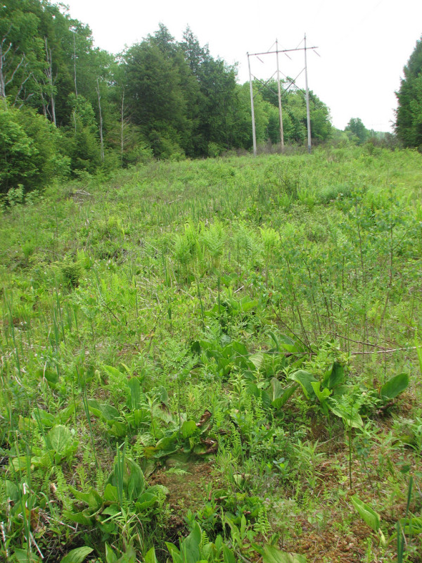 In Pennsylvania, this community type is most characteristic of the northwestern glaciated section, although it may occur elsewhere. These are wetlands that have developed under the influence of base-rich water, and usually have a substantial organic layer. The pH of surface water during the growing season ranges from 6.9 to 7.9. Structurally, they are dominated by a mixture of shrubs and herbaceous plants (predominantly sedges). Most sites have an area in the wettest portion that is without woody growth. Also, within the wetland complex, there are frequently areas of visible surface flow (seeps). Characteristic shrubs include alder-leaved buckthorn (Rhamnus alnifolia), willows (Salix spp.), velvetleaf blueberry (Vaccinium myrtilloides), dwarf raspberry (Rubus pubescens), highbush blueberry (Vaccinium corymbosum), speckled alder (Alnus incana ssp. rugosa), arrow-wood (Viburnum recognitum), and red-osier dogwood (Cornus sericea). The herbaceous species vary; some typical representatives are golden ragwort (Packera aurea), water avens (Geum rivale), rough-leaved goldenrod (Solidago patula ssp. patula), boneset (Eupatorium perfoliatum), field horsetail (Equisetum arvense), fowl mannagrass (Glyceria striata), sedge (Carex interior), many-fruited sedge (Carex lasiocarpa), sedge (Carex hystericina), turtlehead (Chelone glabra), marsh fern (Thelypteris palustris), skunk-cabbage (Symplocarpus foetidus), sedge (Carex lacustris), and common cat-tail (Typha latifolia). Some sites may contain calciphilic species such as golden-fruited sedge (Carex aurea), yellow sedge (Carex flava), prairie sedge (Carex prairea), Atlantic sedge (Carex sterilis), sedge (Carex tetanica), thin-leaved cotton-grass (Eriophorum viridicarinatum), spike muhly (Muhlenbergia glomerata), and grass-of-Parnassus (Parnassia glauca). Characteristic bryophytes include Campylium stellatum, Plagiomnium ellipticum, Sphagnum palustre, Bryum pseudotriquetrum, and Climaceum americanum. On many of these sites, microtopography and vegetation response creates a tight mosaic of locally different chemical conditions. Hummocks of mosses, especially Sphagnum spp., form at the base of shrubs and stumps and lower the pH in their immediate surroundings. This provides a suitable habitat for acid-loving species like blueberries (Vaccinium spp.), bluebead and speckled wood lilies (Clintonia spp.), teaberry (Gaultheria procumbens), and Eastern hemlock (Tsuga canadensis).