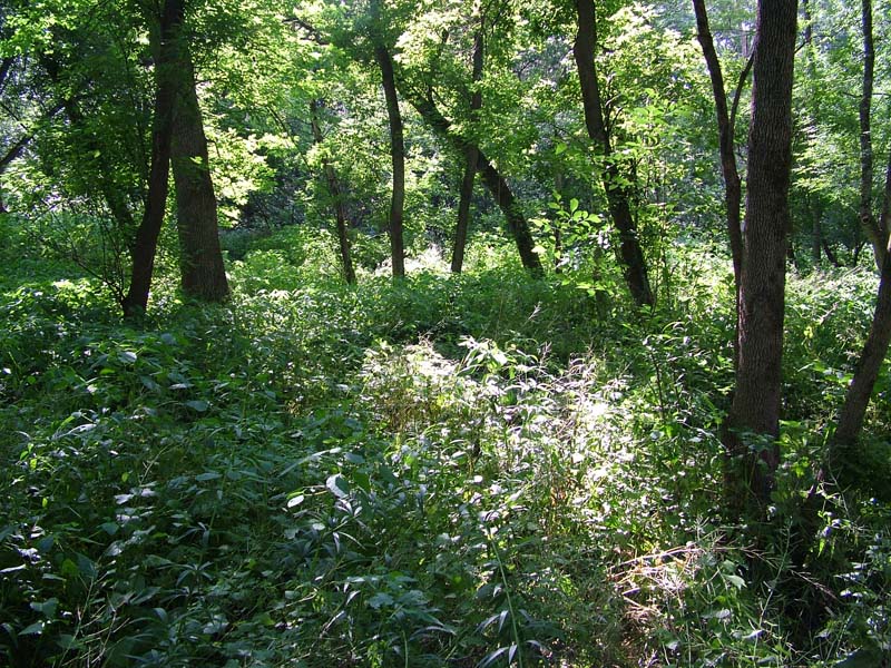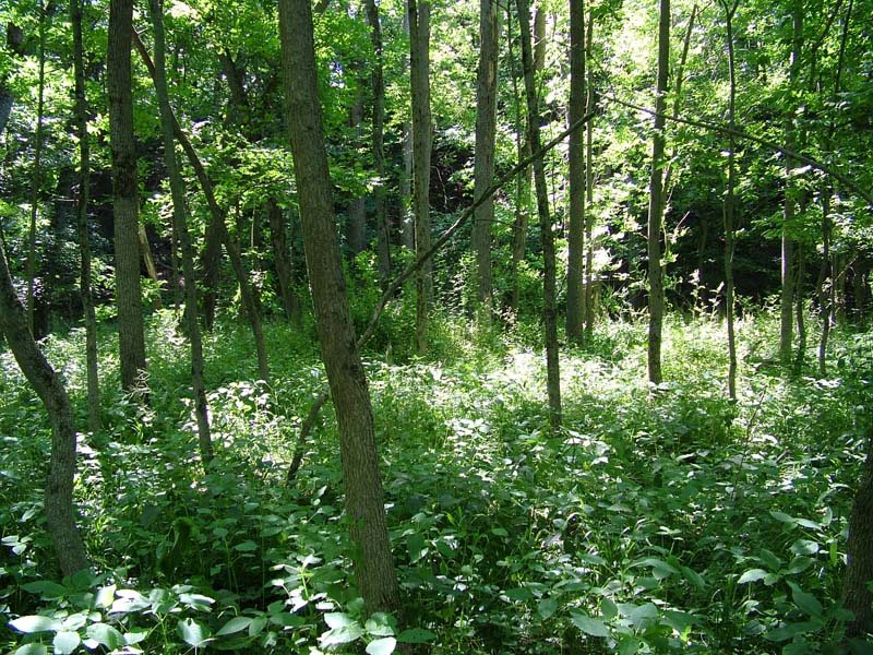 The canopy of this community is dominated by green ash (Fraxinus pennsylvanica) and may contain one or more other hardwood species as sub-dominants, including black walnut (Juglans nigra) and sycamore (Platanus occidentalis). Other less common canopy species include American elm (Ulmus americana), hackberry (Celtis occidentalis), red maple (Acer rubrum), silver maple (Acer saccharinum), and pin oak (Quercus palustris). The subcanopy and shrub layers are often sparse (occasionally dense at some sites) and are characterized by regeneration of canopy tree species and some shrub species such as spicebush (Lindera benzoin). Where exotic species are not rampant, the herbaceous layer is characterized by jewelweed (Impatiens spp.), wood nettle (Laportea canadensis), wingstem (Verbesina alternifolia), Canadian waterleaf (Hydrophyllum canadense), poison ivy (Toxicodendron radicans), and Virginia creeper (Parthenocissus quinquefolia). A number of examples of this community have been heavily impacted by exotic herbaceous species, which may attain a total cover in excess of 90 percent. Common exotic species include multiflora rose (Rosa multiflora), Morrow’s honeysuckle (Lonicera morrowii), common privet (Ligustrum vulgare), Japanese barberry (Berberis thunbergii), Japanese stiltgrass (Microstegium vimineum), Japanese knotweed (Fallopia japonica), dame’s-rocket (Hesperis matronalis), gill-over-the-ground (Glechoma hederacea), and garlic-mustard (Alliaria petiolata).