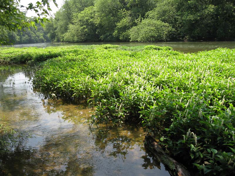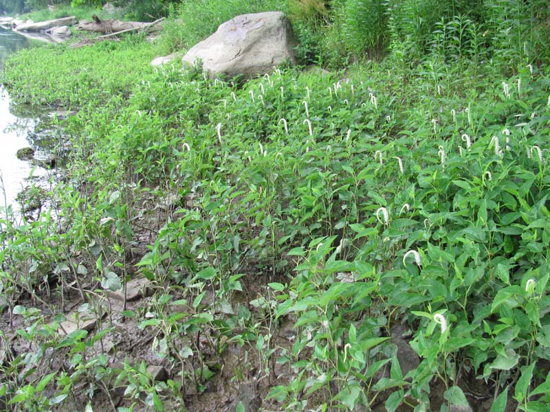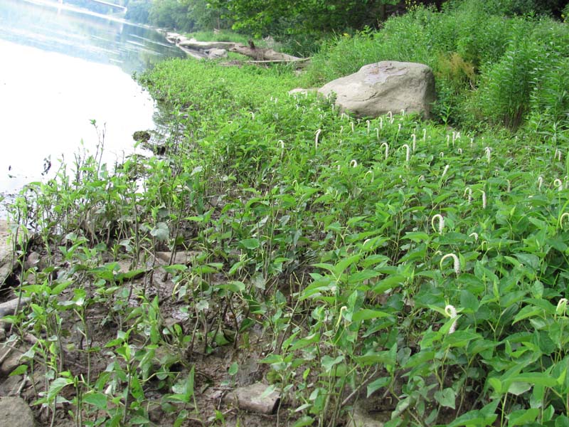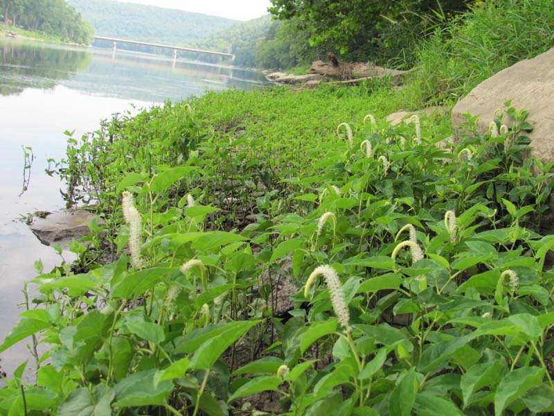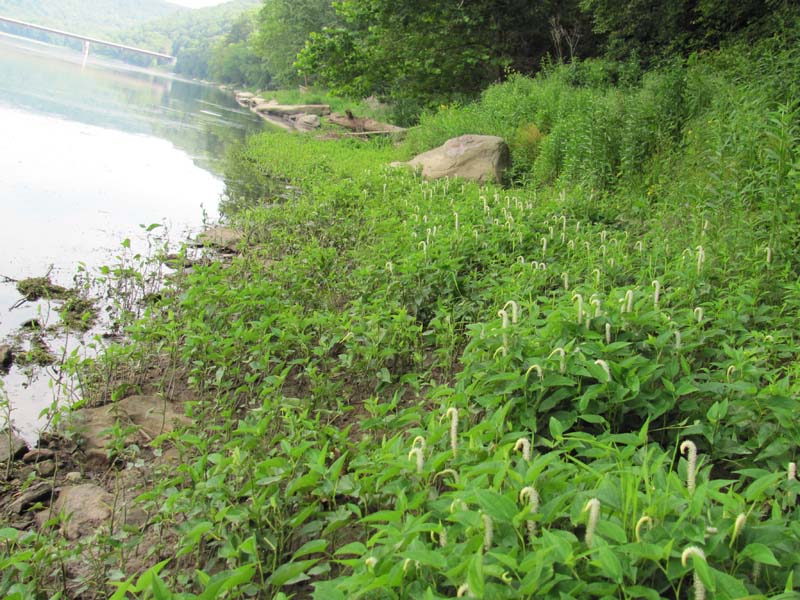 This community is found along river floodplains throughout Pennsylvania, most commonly in the Juniata and Susquehanna River drainages and the smaller tributaries of the main stem of the Susquehanna in the Ridge and Valley Province. The emergent beds typically occur near bars, islands, and river banks, or in shallow portions of the river channel where silt accumulates. It can also be found in back-channels, abandoned oxbow wetlands and other wet depressions on river floodplains. The lower portion of the lizard’s-tail stems are under water for most of the year, with the tops of the plants emerging above the flowing water. These beds are frequently submerged during flood events.