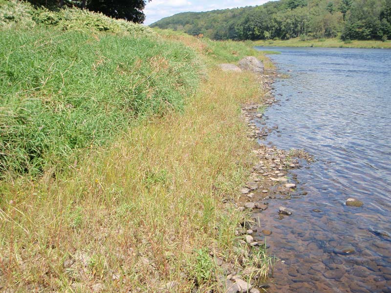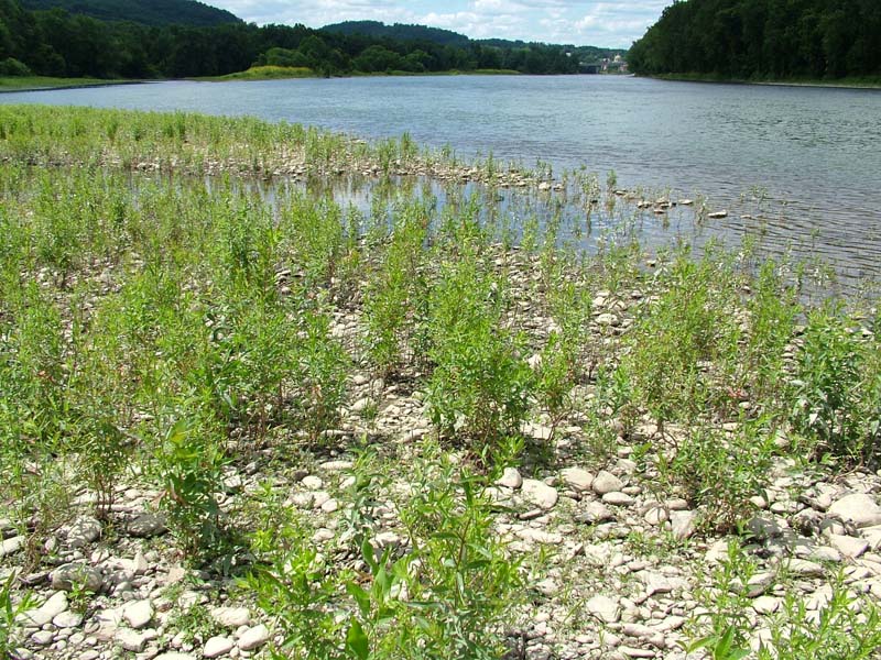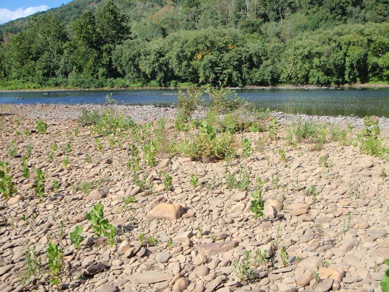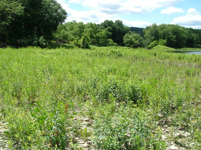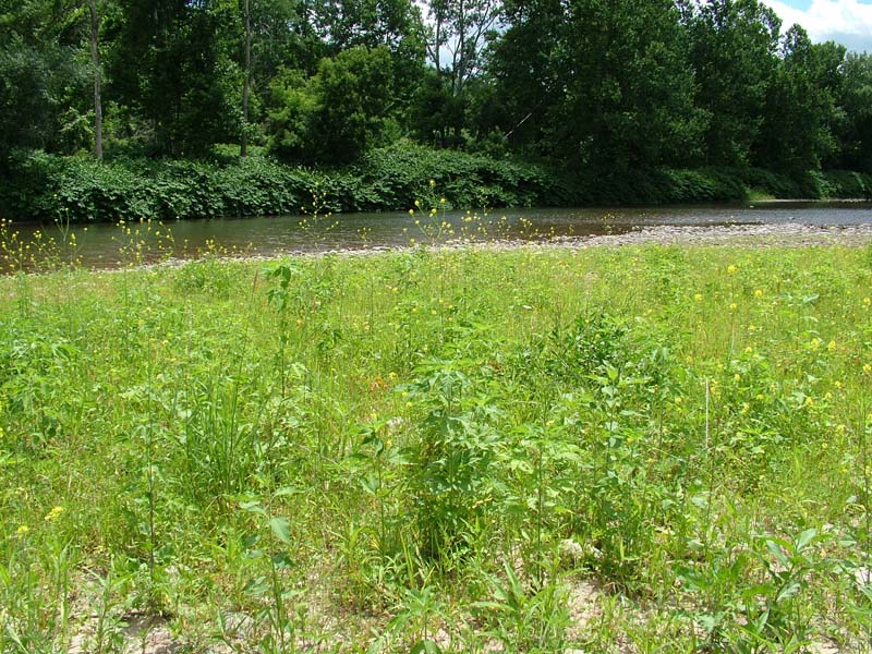 This type typically describes sparsely vegetated sites. The species composition of the community varies depending upon the available seed bank, surrounding vegetation, type of substrate, ecoregion, and hydrologic conditions. Non-native and opportunistic species, many of which are annuals, make up a high proportion of the vegetation at these sites. The perennial species that do exist are those that can tolerate the frequent disturbance of flood events. Not all of the species listed below will be present at the same site. Many combinations and variations in species composition are possible but may include water-pepper (Persicaria punctata), smartweed (P. pensylvanicum), water smartweed (P. amphibia), straw-colored nutsedge (Cyperus strigosus), redroot flatsedge (Cyperus erythrorhizos), lovegrass (Eragrostis frankii), three-seeded mercury (Acalypha rhomboidea), blue vervain (Verbena hastata), cordgrass (Spartina pectinata), boneset (Eupatorium perfoliatum), willow-herb (Epilobium ciliatum), pale St. John’s-wort (Hypericum ellipticum), dwarf St. John’s-wort (H. mutilum), garden loosestrife (Lysimachia vulgaris), swamp-candles (Lysimachia terrestris), American barnyard grass (Echinochloa muricata), late-flowering thoroughwort (Eupatorium serotinum), marsh-purslane (Ludwigia palustris), Autumn bent (Agrostis perennans), cocklebur (Xanthium strumarium), evening-primrose (Oenothera biennis), clearweed (Pilea pumila), Allegheny monkey-flower (Mimulus ringens), false pimpernel (Lindernia dubia), bugleweed (Lycopus uniflorus), cardinal-flower (Lobelia cardinalis), marsh St. John’s-wort (Triadenum virginicum), marsh pennywort (Hydrocotyle americana), field horsetail (Equisetum arvense), spikerushes (Eleocharis erythropoda, E. palustris, E. acicularis, E. tenuis, and E. obtusa), rushes (Juncus acuminatus, Juncus canadensis), spotted spurge (Euphorbia maculata), carpetweed (Mollugo verticillata), lady’s-thumb (Persicaria maculosa), low smartweed (Persicaria longiseta),creeping lovegrass (Eragrostis hypnoides), and umbrella sedge (Cyperus squarrosus). Exotic species found in this community include purple loosestrife (Lythrum salicaria), reed canary-grass (Phalaris arundinacea), Japanese knotweed (Fallopia japonica), and Japanese stiltgrass (Microstegium vimineum)