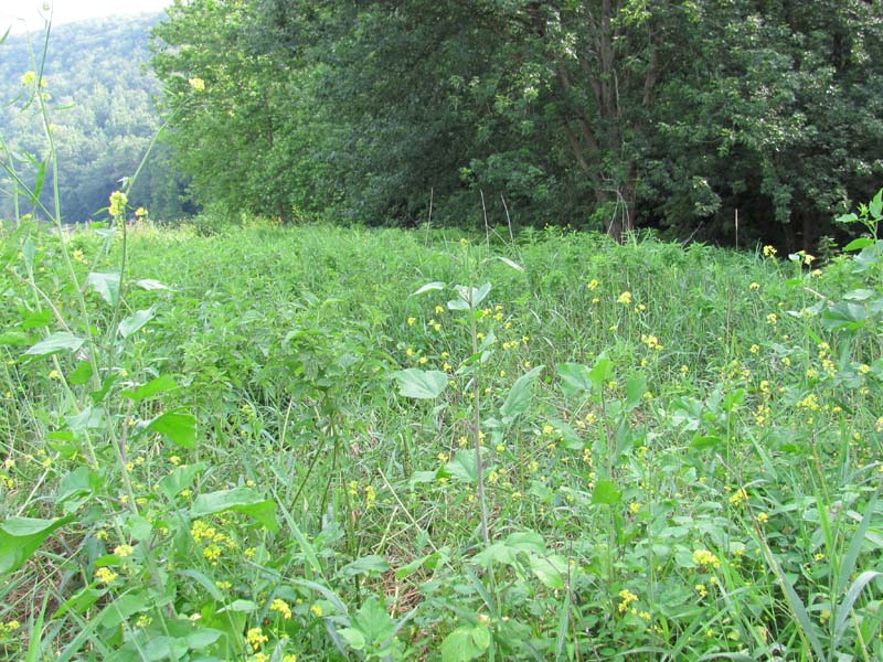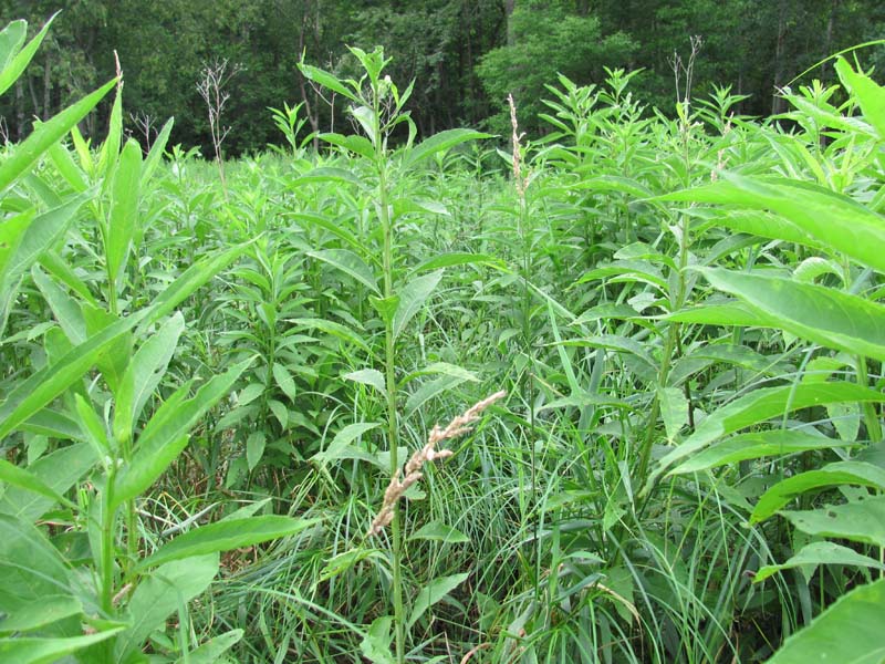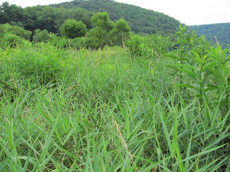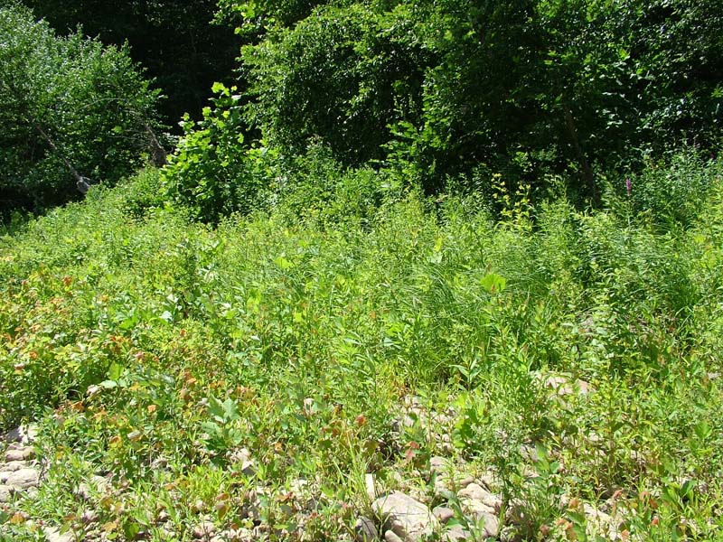 The vegetation is characteristically “meadow-like,” composed of a dense herbaceous layer of tall forbs and graminoids. Shrubs, while often present, make up less than 15% of the plant cover. Species include goldenrods (Solidago rugosa, S. canadensis, S. gigantea, Euthamia graminifolia), wingstem (Verbesina alternifolia), reed canary-grass (Phalaris arundinacea), jewelweed (Impatiens capensis), Joe-Pye-weed (Eutrochium fistulosum), spotted Joe-Pye-weed (E. maculatum), boneset (Eupatorium perfoliatum), common sneezeweed (Helenium autumnale), twisted sedge (Carex torta), tussock sedge (C. stricta), cardinal-flower (Lobelia cardinalis), smartweed (Persicaria pensylvanica), blue vervain (Verbena hastata), bulrush (Scirpus polyphyllus), big bluestem (Andropogon gerardii), deer-tongue grass (Dichanthelium clandestinum), muhly (Muhlenbergia spp.), creeping bent (Agrostis stolonifera var. palustris), autumn bent (A. perennans), Virginia cutgrass (Leersia virginica), Indian-hemp (Apocynum cannabinum), beggar-ticks (Bidens spp.), field horsetail (Equisetum arvense), false nettle (Boehmeria cylindrica), bugleweed (Lycopus uniflorus), common yellow wood-sorrel (Oxalis stricta), violets (Viola spp.), wild mint (Mentha arvensis), flat-topped white aster (Doellingeria umbellata), calico aster (Symphyotrichum lateriflorus), marsh pennywort (Hydrocotyle americana), and riverbank wild-rye (Elymus riparius). Scattered short shrubs may be present, including river birch (Betula nigra), diamond willow (Salix eriocephala), and spicebush (Lindera benzoin). Vines, such as riverbank grape (Vitis riparia) and virgin’s-bower (Clematis virginiana) are often found in this type. This type is particularly susceptible to invasion by Japanese knotweeds (Fallopia japonica and F. sachalinense).
