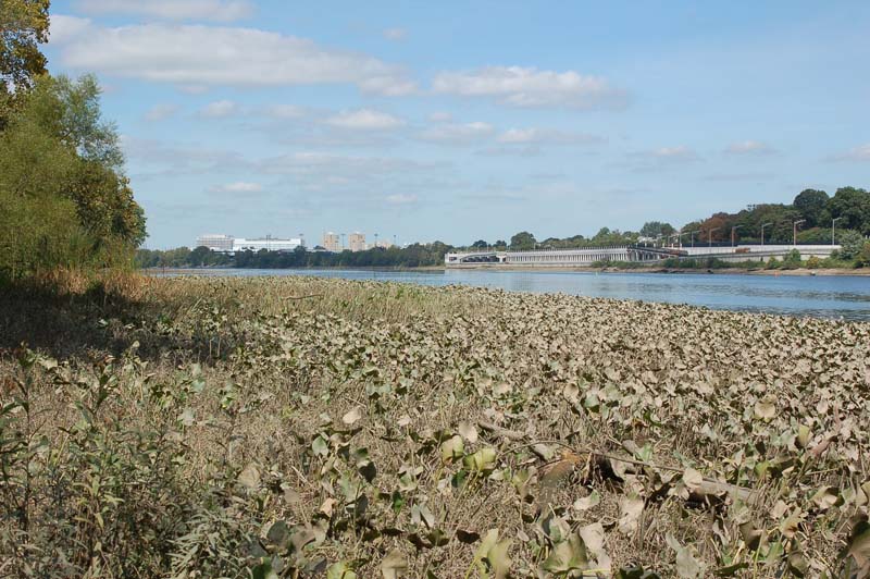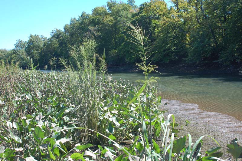 The riverbank tidal marsh is typically distinctly zoned parallel to the shoreline. The uppermost zone, where the water at high tide is less than 0.5 meter deep, provides habitat for emergent species such as wild-rice (Zizania aquatica), salt-marsh water-hemp (Amaranthus cannabinus), swamp beggar’s-ticks (Bidens bidentoides), showy bur-marigold (Bidens laevis), pickerel-weed (Pontederia cordata), arrow-arum (Peltandra virginica), and water-pepper (Persicaria punctata). These species are also found in the high marsh community. The non-native invasive species common reed (Phragmites australis ssp. australis) and Chinese lobelia (Lobelia chinensis) also occur in this zone.