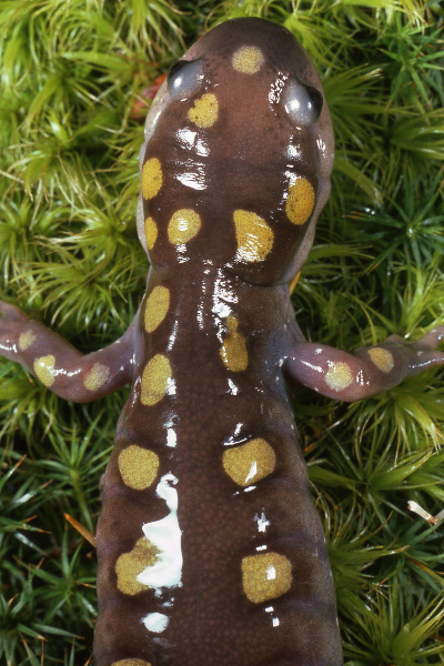 The spotted salamander is the most common mole salamander in Pennsylvania. Adult spotted