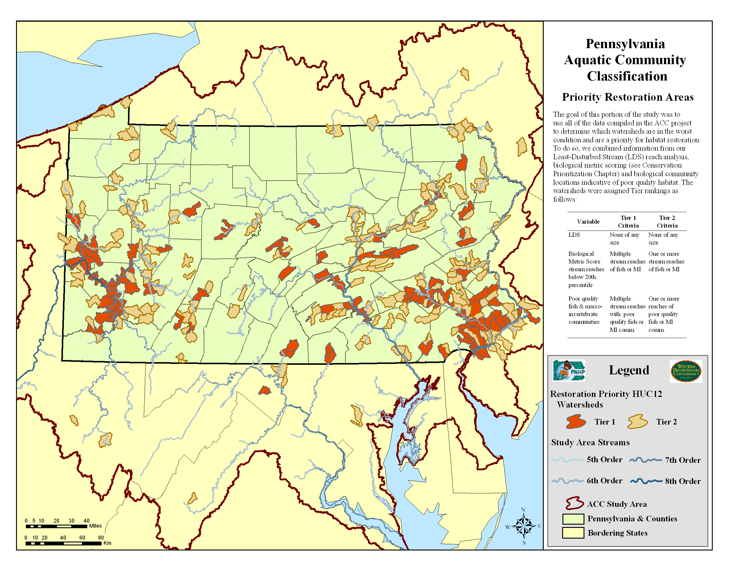 This analysis is meant to suggest which watersheds in the state may be in the greatest need of restoration activity. The water quality issues that are affecting these watersheds may differ significantly, therefore the measures necessary to improve water quality will vary as well. The watersheds listed as part of this "restoration" category should be used only to guide conservation efforts; on-the-ground site visits and knowledge of specific streams and watersheds will be needed to verify conditions that have been described here. The most common water quality problems in Pennsylvania are discussed in Chapter 11 of the ACC User's Manual.