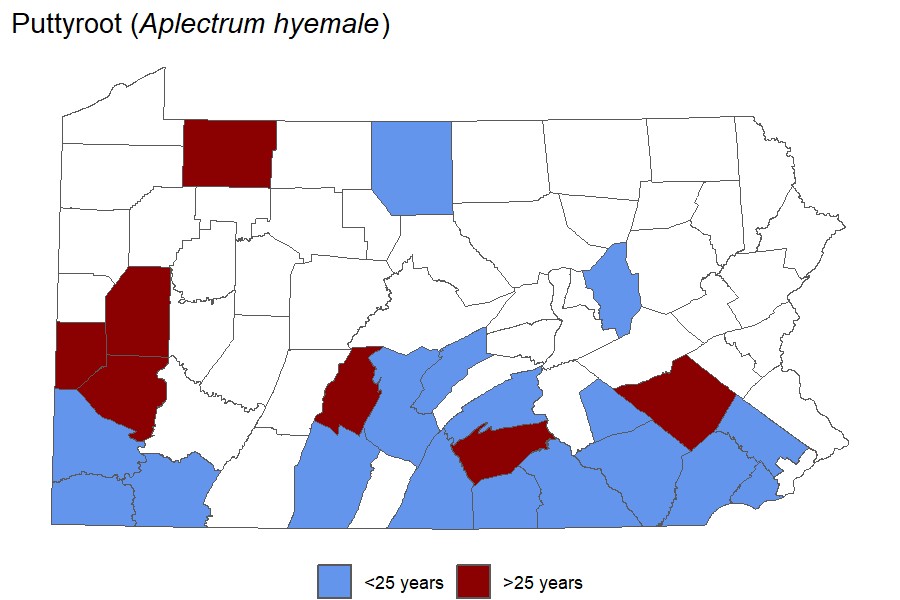 Puttyroot's forest habitats have been fragmented by logging and invaded by exotic species. Although the species' worldwide population is considered secure, it is considered rare in Pennsylvania and other states at the edge of its range